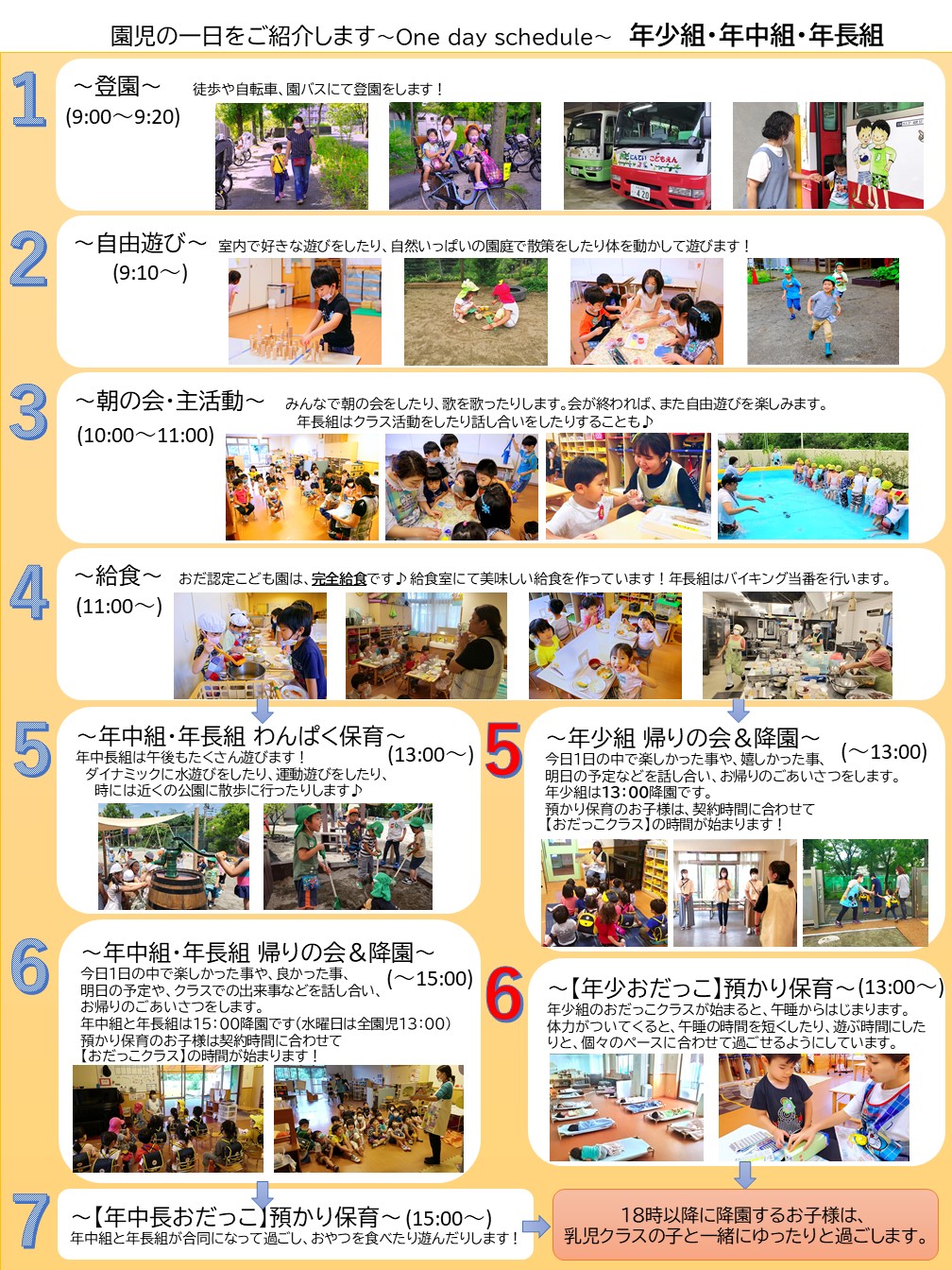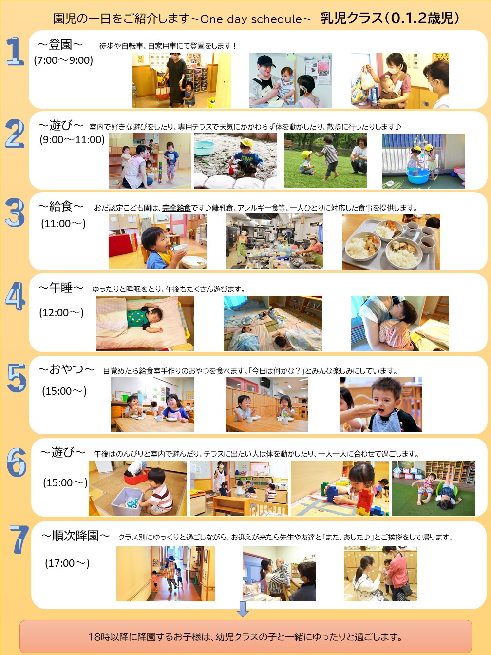乳児クラスと幼児クラスで載せています。ご覧ください。