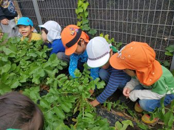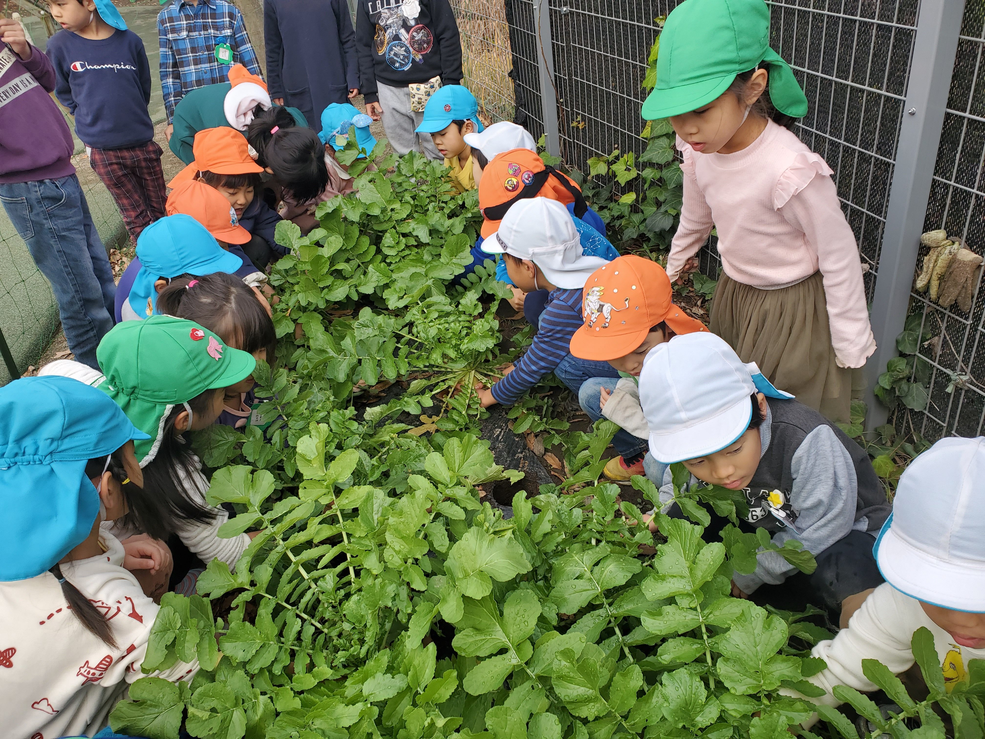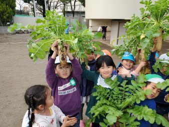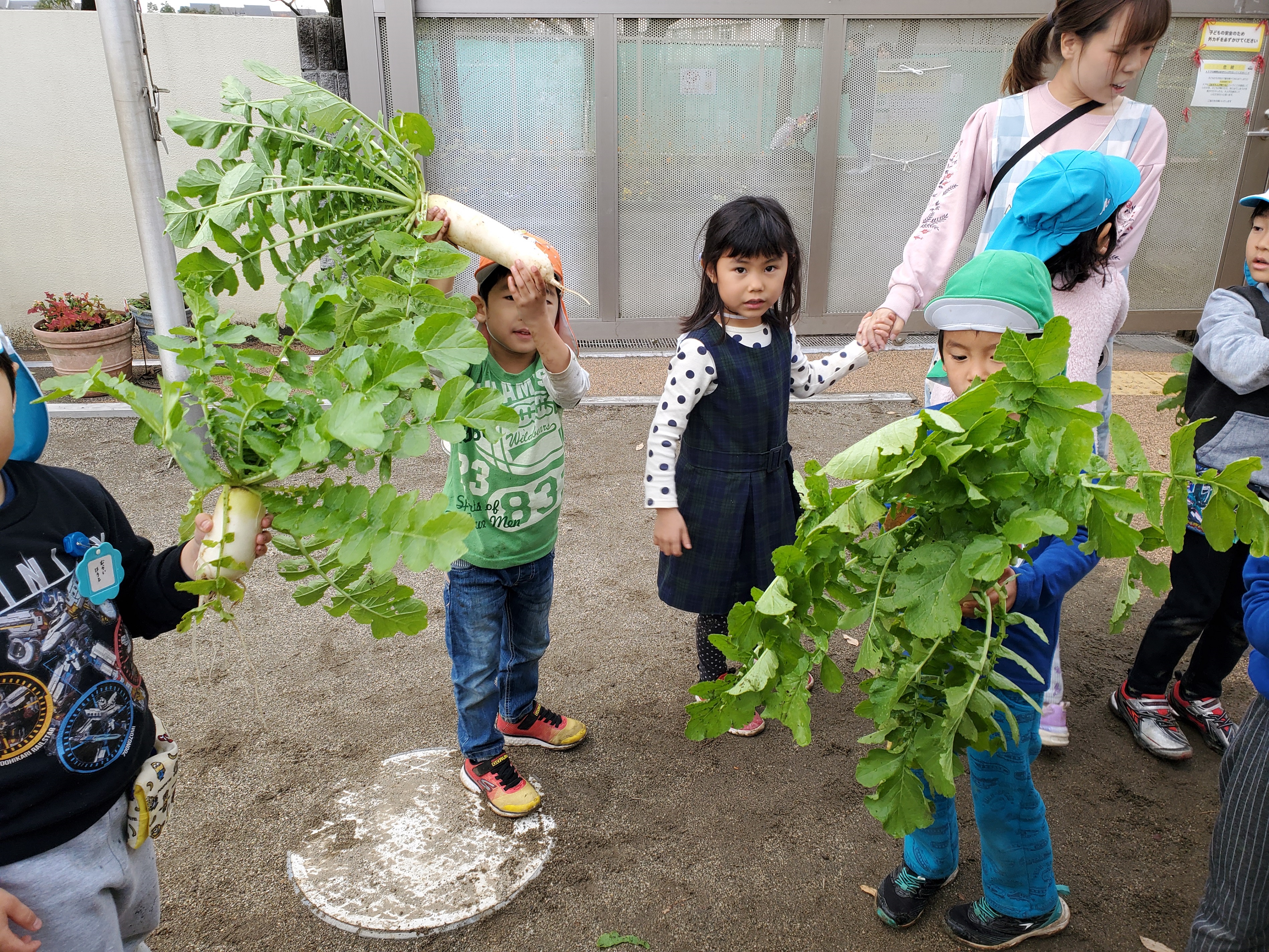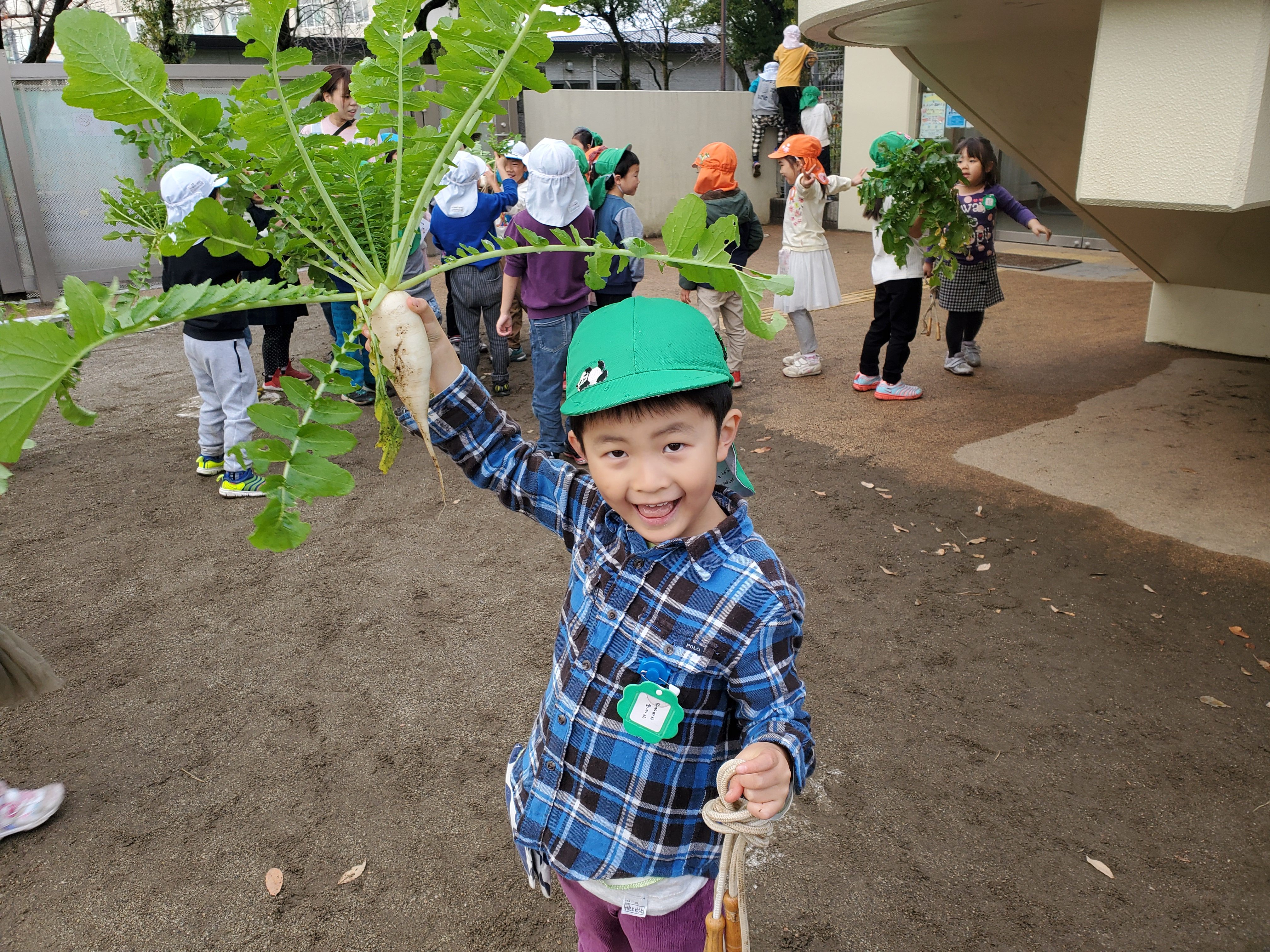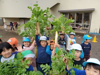 本日、わんぱく保育の時間に年長組は畑の大根を抜きました。