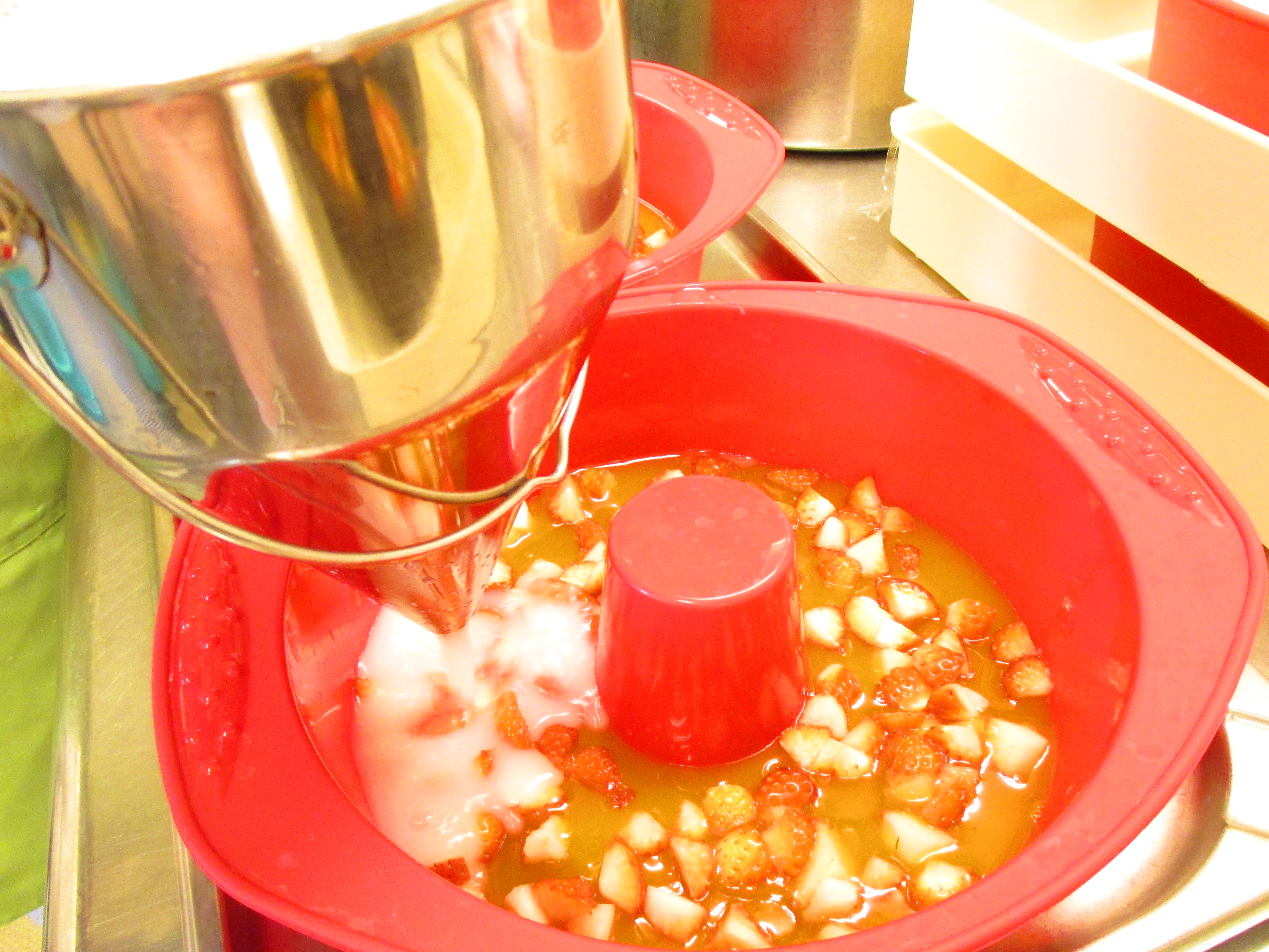 ②冷蔵庫で数時間置き固まったらいちごとカルピスゼリー+三温糖+ゼラチン液を入れます。