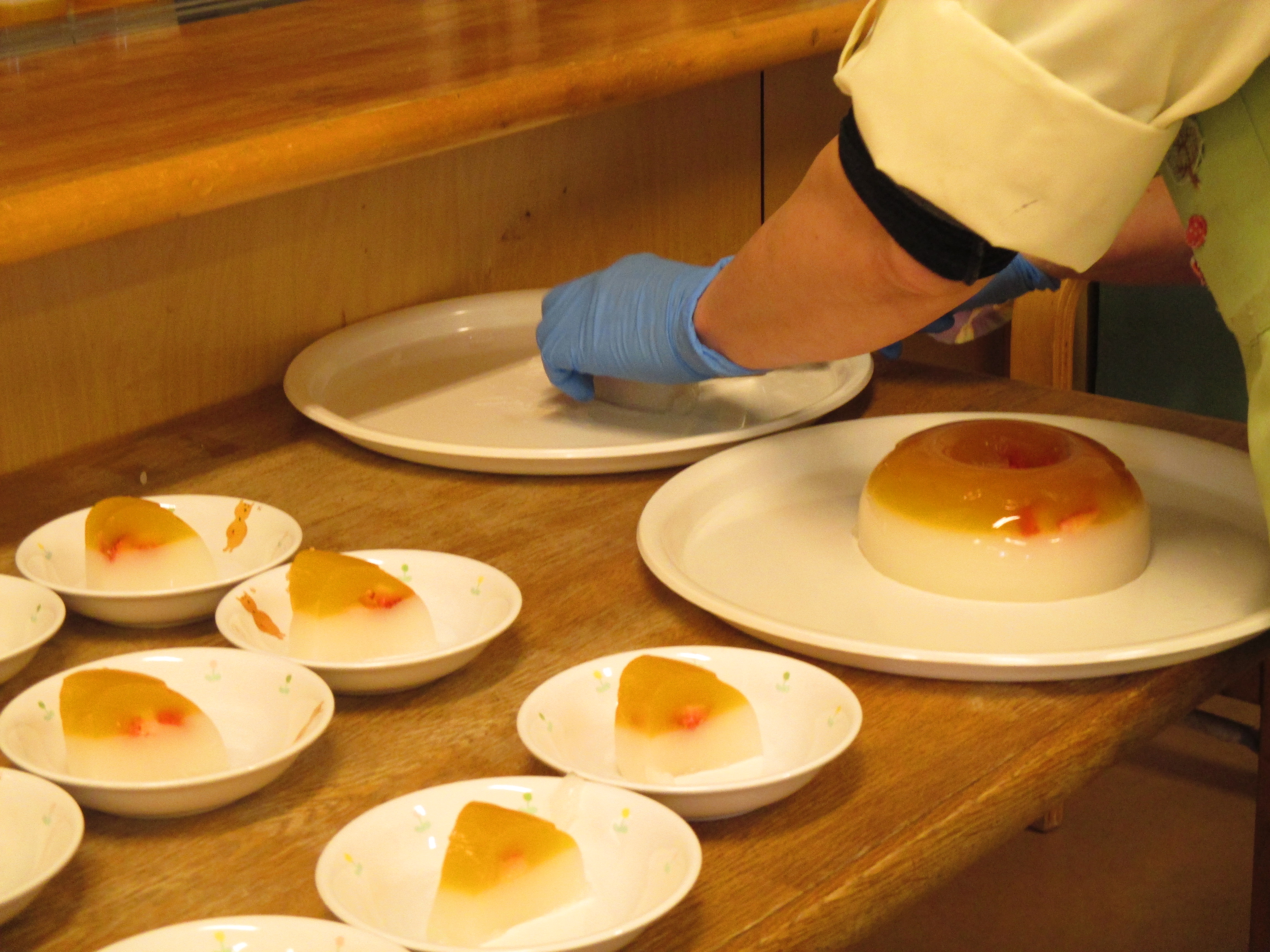 今日の給食は、私達のつくる給食をいつもたくさん食べてくれてありがとう の気持ちを込めて作りました。どんな献立だったら喜んでくれるかな?いつもと違うデザートにしたらどうだろう?などなど沢山悩んで決めました。特に、デザートの2色ゼリーは大きな型に時間差で固めて作るので、いつものカップを使用するゼリー作りのジュースの液量やゼラチン・三温糖の割合が当てはまらず、長い間何度も試作を重ねてきました。大きいゼリーを型から外すのもドキドキです。本番を迎えた今日はゼリー担当者自ら各クラスにゼリーを運びました。ワゴンをささやかに飾り付けし、子ども達がどんな反応をしてくれるのか緊張しながら各クラスに持っていくと…どのクラスの子ども達も、いつもと違うゼリーに驚く顔や立ち上がって喜び合う姿がありました!子供達の嬉しそうな姿をみると頑張って作って良かった、これからももっと頑張ろうと励まされますし活力になります。年長さん、小学校へいっても新しい友達と仲良く美味しく食べてください。進級するみんな、4月になってももりもり給食食べてくれると嬉しいな♪