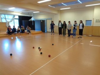 ・パラリンピックを目前に園ではハンディキャップのある方達も楽しく対戦が出来る「ボッチャ」にチャレンジしました。一投ずつ投げ合い、最後に的となる白ボールに1番近くに到達していたチームが勝ちとなります。ほとんどの職員が初めてのボッチャ体験でしたが皆熱くなって対戦を楽しみました。今後、園児達とも楽しめる活動となります。