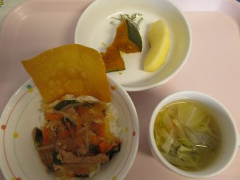パリパリ春巻き丼・旬スープ・かぼちゃの甘煮・りんご(小魚)