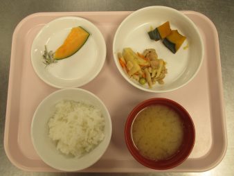 献立:ごはん あおさの味噌汁 たけのこと鶏肉の旬ソテー かぼちゃの甘煮 メロン