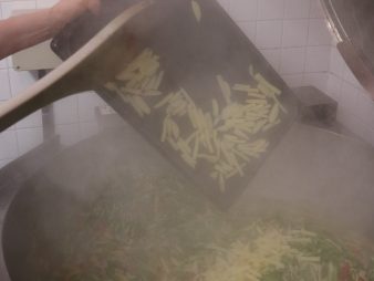 本来なら、じゃが芋も一緒に炒めるところですが大量調理となると、せっかくのじゃが芋がボロボロになってしまうので、別焼きしたものを後から加えます