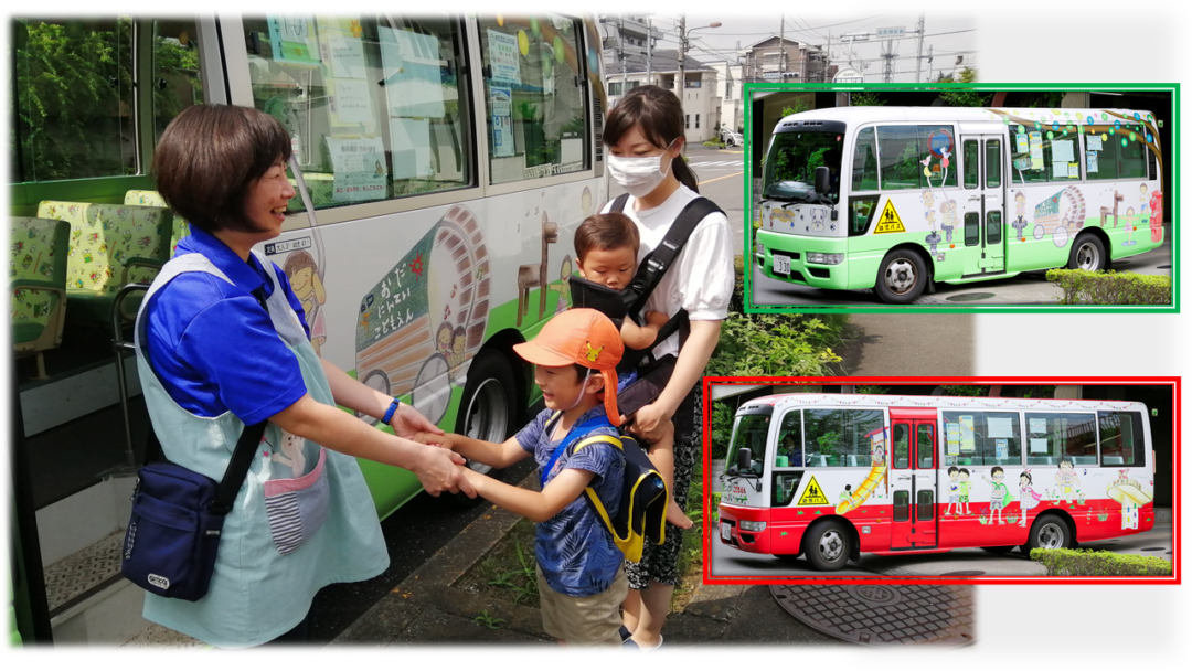 おだ認定こども園では、2台のバスを所有し4コースの運行を行っています(2025年度)。園での乗降は地下駐車場のため、安全かつ雨にぬれることなく、乗降することが出来ます。